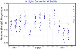 Xi Boötis, Latinised from ξ Boötis, is a binary star[9] system located at a distance of 22 light-years away from Earth. It is the nearest visible star in the constellation Boötes. The brighter, primary component of the pair has a visual magnitude of 4.70, making it visible to the naked eye.