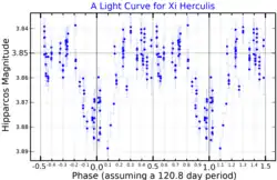 Xi Herculis was discovered to be a variable star when the Hipparcos data was analyzed.[14] It's is a semiregular variable star, oscillating in brightness by 3 hundredths of a magnitude, over a period of 120.8 days.[15]