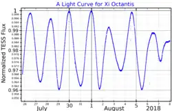 When the Hipparcos catalogue was released in 1997, Xi Octantis was found to vary in magnitude[20] — ranging from 5.32 to 5.36 based on data from the International Variable Star Index.[2] It has since been classified as a Slowly pulsating B-dwarf with a period of 1.78 days.[2]