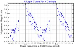 - ↑ Evans, Nancy R. (1992). "The Luminosity of the Double-Mode Cepheid y Carinae". The Astrophysical Journal. 385: 680. Bibcode:1992ApJ...385..680E. doi:10.1086/170974.