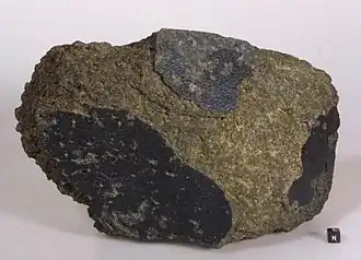 Yamato 000593 (or Y000593) is the second largest meteorite from Mars found on Earth.[2][5][6] Studies suggest the Martian meteorite was formed about 1.3 billion years ago from a lava flow on Mars.[7] An impact occurred on Mars about 11 million years ago[7] and ejected the meteorite from the Martian surface into space. The meteorite landed on Earth in Antarctica about 50,000 years ago. The mass of the meteorite is 13.7 kg (30 lb) and has been found to contain evidence of past water alteration.[2][5][6][8]