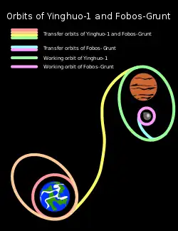 China's Yinghuo-1 and the Russian Fobos-Grunt spacecraft were launched together aboard a Ukrainian Zenit rocket with a Fregat upper stage from Baikonur Cosmodrome, Kazakhstan, on 8 November 2011.[2][13] Shortly after launch, Fobos-Grunt was expected to perform two burns to depart Earth orbit and begin its journey to Mars. However, these burns did not take place, stranding the two spacecraft in their parking orbit.[16] Despite repeated efforts to contact the launcher and rectify the problem, the spacecraft continued to lose altitude.[17] On 17 November, Chinese state media formally declared the Yinghuo-1 probe lost,[8] and the launcher's orbit gradually began to decay.