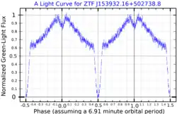 ZTF J153932.16+502738.8 is a double binary white dwarf with an orbital period of just 6.91 minutes. Its period has been observed to be decreasing, due to the emission of gravitational waves. It is both an eclipsing binary and a double-lined spectroscopic binary.[1] The hotter white dwarf is 48,900 K, and the other one is significantly cooler (<10,000K). The stars may merge into one in 130,000 years, or if mass transfers between them, they may separate again.[2] Their distance from Earth is estimated at 2.3 kpc.[1]