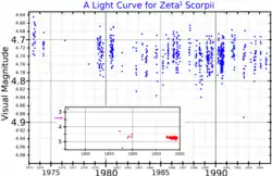 A visual band light curve for Zeta1 Scorpii, adapted from Sterken et al. (1997).[10] The inset plot shows the long term variability. The purple arrow shows the brightness reported by al-Sufi in A.D. 962.