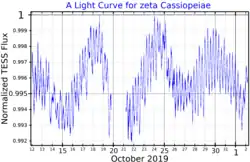 Zeta Cassiopeiae is a probable member of an unusual group of variable stars known as "Slowly Pulsating B" (SPB) stars.[16] It shows a pulsation frequency of 0.64 per day (or once every 1.56 days) and displays a weak magnetic field with a strength of roughly 3.35 × 10−2 T, which varies with a period of 5.37 days.[17] This likely matches the rotation rate of the star, which, when combined with the low projected rotational velocity, indicates the star may be seen nearly pole-on. Zeta Cassiopeiae is a candidate magnetic Bp star that shows an overabundance of helium. The star contains a randomly oriented fossil magnetic field, which impacts the outflow of the stellar wind. Collisions between streams from this stellar wind creates a shock front, with cooling particles settling toward a co-rotating disk.[18]