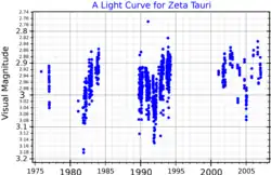 Zeta Tauri shows variation in its spectrum and brightness. The General Catalogue of Variable Stars lists it as an eclipsing variable and a Gamma Cassiopeiae variable,[3] but it may not be either.[19][20] Hrvoje Božić and Krešimer Pavlovski, of Hvar Observatory in Croatia, monitored the brightness of Zeta Tauri from 1981 to 1986 and noticed an eclipse like effect in the light curve.[21] A latter study of all the available photometric data, including from the Hipparcos spacecraft, failed to confirm the presence of eclipses.[20]
