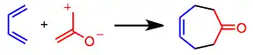 A (4+3) cycloaddition[1] is a cycloaddition between a four-atom π-system and a three-atom π-system to form a seven-membered ring. Allyl or oxyallyl cations (propenylium-2-olate) are commonly used three-atom π-systems, while a diene (such as butadiene) plays the role of the four-atom π-system. It represents one of the relatively few synthetic methods available to form seven-membered rings stereoselectively in high yield.[2]