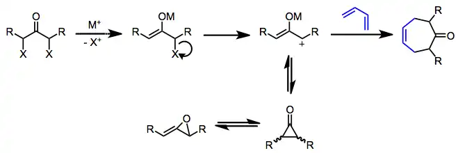 Oxyallyl cations (propenyliumolates) may be generated under reductive, mildly basic, or photolytic conditions. Reduction of α,α'-dihalo ketones is a very popular method for generating symmetric oxyallyl cations.[4] After formation of a metal enolate, dissociation of halide generates a positively charged oxyallyl intermediate. This electron-deficient 2π component reacts with electron-rich dienes to give cycloheptenones. Cyclic dienes fare better than the corresponding acyclic dienes because in order to react, the diene must be in the s-cis conformation in the presence of the short-lived oxyallyl cation—cyclic dienes are locked in this reactive conformation.