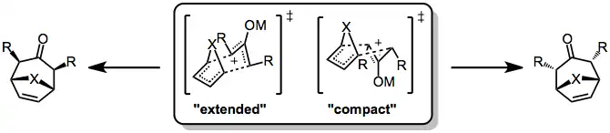 Stereochemical control in the (4+3) cycloaddition is not as strict as in the Diels-Alder reaction, because the former often proceed through stepwise, polar pathways. Even when the reaction is concerted, complications may arise due to conformational dynamics in the oxyallyl component, which can exist in "W," "U," or "sickle" forms. Generally, however, the "W" form dominates. Even so, two stereochemically distinct transition states are possible: a chair-like, "extended" TS which leads to a cis relationship between the bridging atom and oxyallyl substituents, and a boat-like, "compact" TS which leads to a trans relationship.