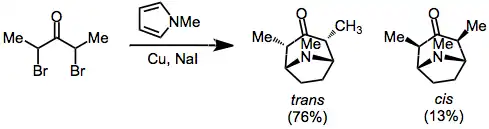 Reduction of α,α'-dihalo ketones is an effective method for the generation of oxyallyl cations for cycloaddition. Reducing agents used include copper-bronze.,[8] iron carbonyl complexes.,[7] and copper/zinc[9] As mentioned previously, products exhibiting trans stereochemistry between the bridging atom and the oxyallyl substituents (resulting from the compact transition state) are generally favored.