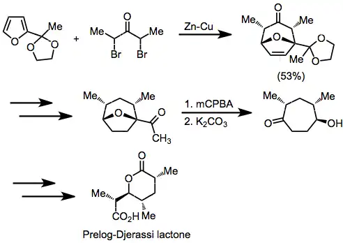 A synthesis of Prelog-Djerassi lactone illustrates how stereocenters set during a (4+3) cyclization may be used later for stereochemical control.[13] The oxabicyclo[3.2.1]octane products of cycloadditions involving furan may be opened using a variety of methods[14]