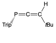 The first example of a stable heteroalkene E=C or E=E' (E, E' = P) containing a heavy group 15 element was reported in 1982 by Yoshifuji.[1][2] After the realization of heavier heteroalkenes, the field of organometallic chemistry began exploring the idea of heteroallenes E=C=E' and E=C=C=E', in which one or more carbon atom of an allene is substituted by a heavier atom. The first of these heteroallenes containing a heavier group 15 element to be reported was synthesized in 1984 by Yoshifuji.[3] 1-phosphaallene, also referred to as ethenylidenephosphine or λ3-phosphaallene, was first synthesized using the 2,4,6-tri-t-butylphenyl (supermesityl, or Mes*) moiety as a sterically protecting group.[4][5] The most widely known example of 1-phosphaalenes is the Mes* substituted 3H-phosphallene, where a hydrogen is bonded to the terminal carbon atom, which was synthesized by Märkl and Reitinger in 1988.[6][7] Some more recent advances made in regards to 1-phosphaallenes include the development of simpler synthetic routes and the discovery of synthetic pathways using phosphaallenes to create molecules that are typically only synthesized through complicated methods.