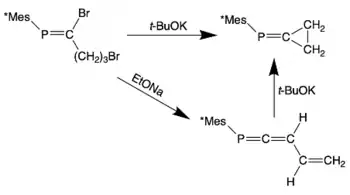 (Z)-2,5-dibromo-1-phosphapent-1-ene with the sterically cumbersome Mes* moiety was reacted with t-BuOK to yield the cyclopropylidenephosphaethene product. Treatment of the (Z)-2,5-dibromo-1-phosphapent-1-ene reagent with a weaker base, EtONa yields a non-cyclic isomer that can undergo cyclization in the presence of t-BuOK.[8]
