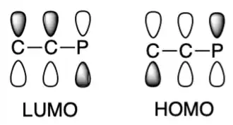 The electronic structure of 1-phosphaallene is nearly identical to that of phosphaalkene. The HOMO in both molecules is the π-orbital of the C=P bond, which is primarily P in character. The LUMO in both structures, is also heavily localized over the C=P bond. However, the dipole moment in phosphaallenes is larger than that of phosphaalkenes.[4]