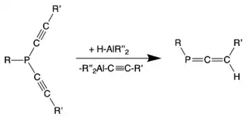 In 2019, a new synthetic route for the synthesis of phosphaallenes was reported by Klöcker and coworkers. The hydroalumination of dialkynylphosphines with different alkylaluminium hydrides resulted in the elimination of dialkylaluminium alkynides and the desired phosphaallenes. Many of the phosphaallenes Klöcker and coworkers synthesized spontaneously decomposed into less-desired products, but the newly reported synthetic method did allow for the isolation of some highly reactive compounds that had not been isolated previously.[9]