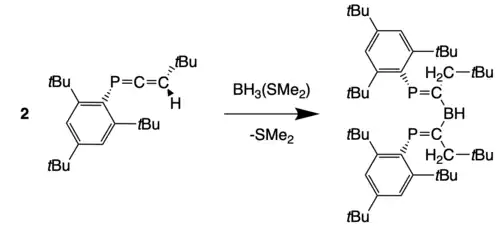Hydroboration is used as a method to reduce unsaturated compounds, and has been used to reduce P-C double or triple bonds in phosphaalkenes and phosphaalkynes. Hydroboration of the 3H-phosphaallene Mes*-P=C=C(H)-tBu with 1:1 molar ratio of phosphaallene to H3B(SMe2) yielded a di(phosphaalkenyl)borane, and the reaction in 2:1 molar ratio of phosphaallene to H3B(SMe2) yielded the desired product with a B atom bound to two P=C double bonds. The hydroboration of the C=C bond was preferred over the hydroboration of the P=C bond.[19]