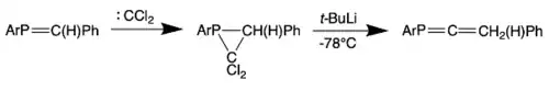 In this synthetic route, a dichlorocarbene is first reacted with a phosphaethylene. The addition of t-BuLi to the resulting 2,2-dichlorophosphirane yields the phosphaallene. This route includes an insertion of carbon into the P=C bond of a phosphaalkene.[4][15]