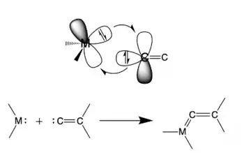 The crystal structure also showed a bent geometry with the P=C=C bond angle at 168.0(3)°.[23] This bent geometry is thought to be a result of both steric and electronic effects. One possible explanation for the observed bent geometry is the bonding model postulated by Lappert et al. which described the bonding between P and the C as singlet states that act in a double π-donor-acceptor fashion.[24][25][26][27]