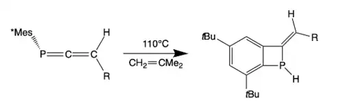Recently, two novel 1-benzodihydrophosphetes were synthesized by heating 3H-phosphaallene Mes*P=C=C(H)R (R = tBu, Ad) in toluene at 110 °C for 16-20h. The resulting 1- benzodihydrophosphetes were not stable unless coordinated to tungsten.[16] The phosphorus-bound H of the product can be used in catalyst-free hydrophosphination reactions and in the synthesis of bulky phosphine ligands.[19]