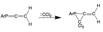 The reaction of phosphaallenes with dichlorocarbenes results in a [2+1]-cycloaddition to the P=C double bond, which results in stable heterocyclic compounds.[4][20]