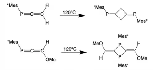 Without a large steric hindrance, most phosphaallenes quickly dimerize in a [2+2]- or [2+3]-cycloaddition to yield four- or five-membered rings.[16] Thus, in order to prevent dimerization, a bulky moiety such as Mes* is often used. Dimerization frequently occurs in a head-to-tail manner, exhibiting coupling between either the two C=C bonds or the two P=C bonds. The regioselectivity of these dimerization reactions depends on the substituents on the C in the 3 position.[3]