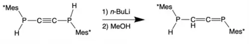 Like the transition from an alkyne to an allene in organic chemistry, phosphaallenes can be synthesized from alkynylphosphines by adding a strong base such as n-butyllithium (n-BuLi). These complexes are typically useful due to the broad range of stable products that can be obtained from this synthetic route.[3][4][13]