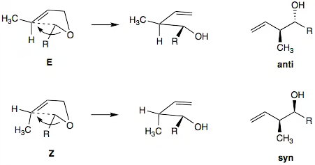 2,3-sigmatropic rearrangements can offer high stereoselectivity. At the newly formed double bond there is a strong preference for formation of the E-alkene or trans isomer product. The stereochemistry of the newly formed C-C bond is harder to predict. It can be inferred from the five-membered ring transition state. Generally, the E-alkene will favor the formation of anti product, while Z-alkene will favor formation of syn product.