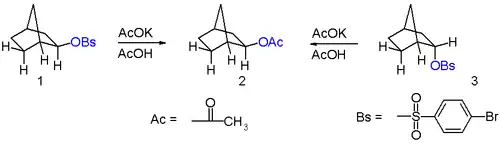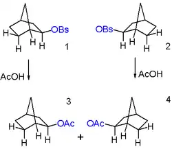For example, the major product of the acetolysis of β-(Δ3-cyclopentenyl)-ethyl nosylate (p-nitrobenzenesulfonate) is 2-exo-norbornyl acetate. The dearth of β-(Δ3-cyclopentenyl)-ethyl acetate present after the reaction is explained by the greater stability of the norbornyl system over the decorated cyclopentenyl system.[6]