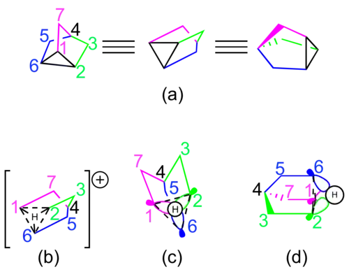 - ↑ Olah, G. A.; Commeyras, A.; Lui, C. Y. (1968). "Stable carbonium ions. LXXII. Raman and N.M.R. Spectroscopic study of the nortricyclonium ion [protonated tricyclo[2.2.1.02,6]heptane] and its relation to the 2-norbornyl [bicyclo[2.2.1]heptyl] cation. The nature of the stable long-lived norbornyl cation in strong acid solutions". Journal of the American Chemical Society. 90 (14): 3882. doi:10.1021/ja01016a062.
