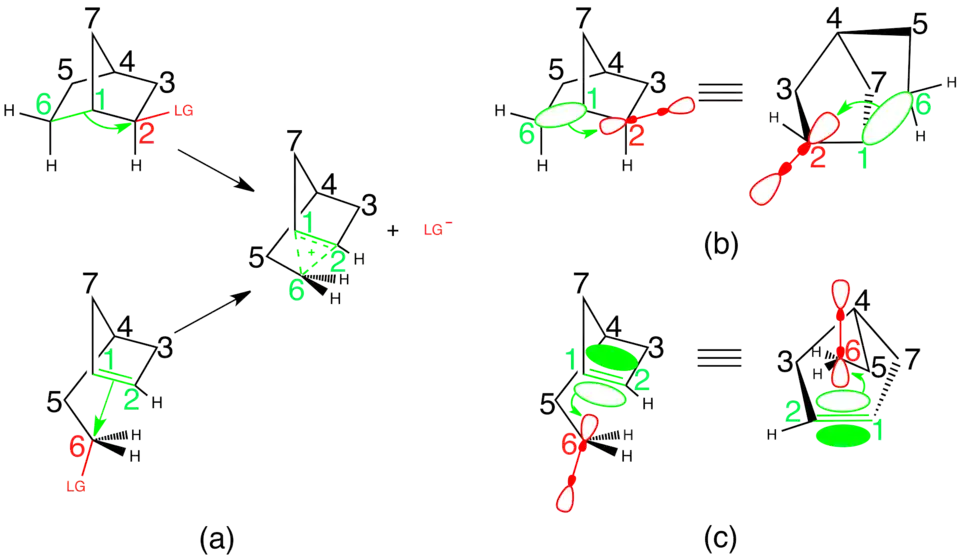 The starting material for this route is a norbornane derivative with a good leaving group in position 2. If the leaving group is on the exo- face, electron density from the σ bond between carbons 1 and 6 is donated into the σ* antibond between carbon 2 and the leaving group (see Figure 8b).[28]