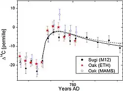 The 774–775 carbon-14 spike is an observed increase of around 1.2% in the concentration of the radioactive carbon-14 isotope in tree rings dated to 774 or 775 CE, which is about 20 times higher than the normal year-to-year variation of radiocarbon in the atmosphere. It was discovered during a study of Japanese cedar tree-rings, with the year of occurrence determined through dendrochronology.[1] A surge in beryllium-10 (10Be), detected in Antarctic ice cores, has also been associated with the 774–775 event.[2] The 774–775 CE carbon-14 spike is one of several Miyake events and it produced the largest and most rapid rise in carbon-14 ever recorded.[3][4]
