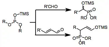 Electron-rich sources of phosphorus such as phosphites, phosphonites, and phosphinites may undergo nucleophilic addition to carbon atoms in simple carbonyl compounds. When fully esterified phosphites are used (Abramov reaction), neutralization of the resulting tetrahedral intermediate usually occurs via the transfer of an alkyl or silyl group from an oxygen attached to phosphorus to the newly created alkoxide center. Conjugate addition is also possible,[3] and gives γ-functionalized carbonyl compounds or enol ethers after group transfer. The use of siloxy-containing phosphorus sources has greatly expanded the scope of this reaction, as the resulting α-siloxy compounds can be converted into the corresponding α-hydroxy derivatives in the presence of an alcoholic solvent[4]