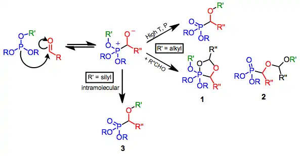 Phosphites add reversibly to the carbonyl carbon of simple carbonyl compounds. Under mild conditions, reversion to the starting materials is faster than both inter- and intramolecular alkyl group transfer—the four-center transition state for intramolecular transfer exhibits poor orbital overlap.[5] Transfer can be facilitated under conditions of high temperature or pressure. If two equivalents of aldehyde are used, addition of the tetrahedral intermediate to a second molecule of aldehyde leads either to cyclic phosphoranes 1 or linear alkyl transfer products 2.