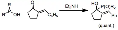 When phosphonous acids are employed in the presence of catalytic amounts of base, phosphine oxides can result. The sodium salts of phosphonous acids have historically worked well in this context, and bases such as sodium amide have been used.[8] However, asymmetric induction and selective direct addition (for conjugated carbonyl compounds) can be achieved in the presence of chiral amine bases.[9]