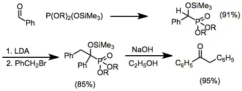 The discovery and use of silylated phosphorus reagents in this reaction represented a methodological advance. Selective silyl group transfer occurs in mixed reagents, and cleavage of the resulting silicon-oxygen bonds can often be accomplished hydrolytically, providing access to α-hydroxy derivatives. Alkylation of α-siloxy products provides a convenient route to otherwise difficult to access α-alkoxy phosphorus compounds. They can function as acyl anion equivalents when deprotonated, and give ketones after elimination under basic conditions.[10]
