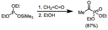 Simple ketones and aldehydes readily undergo addition of phosphites at the carbonyl carbon. In one interesting application, addition to ketenes gives products identical to the Arbuzov reaction of acid halides.[11]