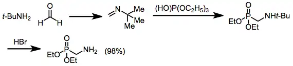 Imines can also undergo the reaction (Pudovik reaction), affording α-alkylamino phosphonates.[13] Primary amines can be produced only after acidic hydrolysis of an intermediate tert-butylamine;[14] the use of unsubstituted imines requires very harsh conditions and gives low yields.