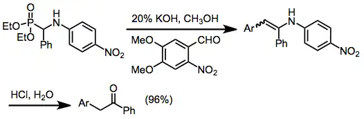 The α-hydroxy alkylphosphonates produced by this method can be used for additional transformations. The original carbonyl carbon is acidified by its proximity to the phosphonate group. Deprotonation at this position generates a masked acyl anion, as the phosphonate functionality can be removed after the anion reacts. Phosphonate anions can undergo alkylation and olefination (the Horner-Wadsworth-Emmons reaction).[15] When α-amino alkylphosphonates are employed in olefination, the resulting enamines can be hydrolyzed to ketones.