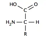 An α-amino acid has a central carbon (the α or alpha carbon) that is covalently bonded to a carboxyl group (thus they are carboxylic acids), an amino group, a hydrogen atom and a variable group. The variable group, also called the R group or side chain, determines the identity and many of the properties of a specific amino acid. In glycine, the simplest amino acid, the R group is a hydrogen atom, but in all other amino acids it is contains one or more carbon atoms bonded to hydrogens, and may contain other elements such as sulfur, oxygen or nitrogen. With the exception of glycine, naturally occurring amino acids are chiral and almost invariably occur in the L-configuration. Peptidoglycan, found in some bacterial cell walls contains some D-amino acids. At physiological pH, typically around 7, free amino acids exist in a charged form, where the acidic carboxyl group (-COOH) loses a proton (-COO−) and the basic amine group (-NH2) gains a proton (-NH+