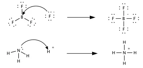 In the first reaction a fluoride ion, F−, gives up an electron pair to boron trifluoride to form the product tetrafluoroborate. Fluoride "loses" a pair of valence electrons because the electrons shared in the B—F bond are located in the region of space between the two atomic nuclei and are therefore more distant from the fluoride nucleus than they are in the lone fluoride ion. BF3 is a Lewis acid because it accepts the electron pair from fluoride. This reaction cannot be described in terms of Brønsted theory because there is no proton transfer.