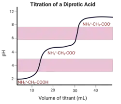 A diprotic acid donates two protons and a diprotic base accepts two protons. The titration curve for a diprotic solution has two equivalence points.[13][9]