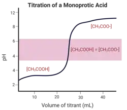 Monoprotic acid titration curve. Highlighted pink region depicts equivalence point.