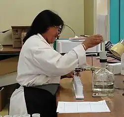 An acid–base titration is a method of quantitative analysis for determining the concentration of Brønsted-Lowry acid or base (titrate) by neutralizing it using a solution of known concentration (titrant).[1] A pH indicator is used to monitor the progress of the acid–base reaction and a titration curve can be constructed.[1]