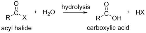 - water, to form a carboxylic acid. This hydrolysis is the most heavily exploited reaction for acyl halides as it occurs in the industrial synthesis of acetic acid.