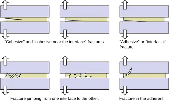 Adhesive fracture (sometimes referred to as interfacial fracture) is when debonding occurs between the adhesive and the adherend. In most cases, the occurrence of adhesive fracture for a given adhesive goes along with smaller fracture toughness.