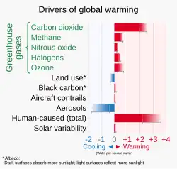 The warming caused by human-produced greenhouse gases has been somewhat offset by the cooling effect of human-produced aerosols. In 2020, regulations on fuel significantly cut sulfur dioxide emissions from international shipping by approximately 80%, leading to an unexpected global geoengineering termination shock.[6]