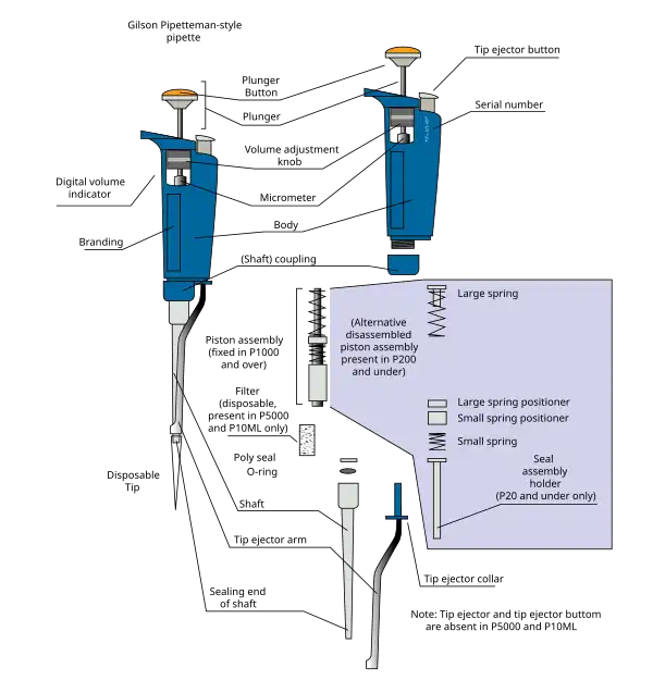 Schematic diagram of an air displacement pipette. The "Digital volume indicator" is a dial display that indicates the digits (i.e. unrelated to electronic). The components vary between brands and different volume sizes have different components, for example the piston in a P2 is needle-like and can be separated with ease from the piston assembly whereas in a P10ML it is drum-like and over 1 cm in diameter and is enclosed in plastic.