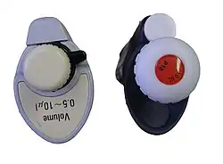 Some air displacement pipettes can additionally feature a locking mechanism (referred to as "locking pipettes") to allow better changing of volume yet preserving accuracy. By locking the set volume while performing several identical pipetting actions, accidental changes to the pipette volume setting are avoided. The lock mechanism is typically a mechanical toggle close to the pipette setting controls that interferes with the setting mechanism to prevent movement. Some pipettes, however, feature dials for setting the individual volume digits that can only be adjusted when unlocked by depressing and twisting the plunger.[11]