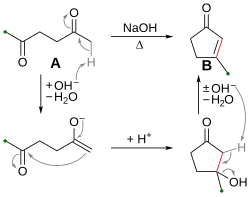 Intramolecular aldol condensation is between two aldehyde groups or ketone groups in the same molecule. Five- or six-membered α, β-unsaturated ketone or aldehydes are formed as products. This reaction is an important approach to the formation of carbon-carbon bonds in organic molecules containing ring systems. As an example, under strong basic conditions (e.g. sodium hydroxide), hexane-2,5-dione (compound A in Figure 1) can cyclize via intramolecular aldol reaction to form the 3-methylcyclopent-2-en-1-one (compound B).