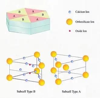 Alite is an impure form of tricalcium silicate, Ca3SiO5, sometimes formulated as 3CaO·SiO2 (C3S in cement chemist notation), typically with 3-4% of substituent oxides.[1] It is the major, and characteristic, phase in Portland cement. The name was given by Alfred Elis Törnebohm in 1897 to a crystal identified in microscopic investigation of Portland cement.[2] Hatrurite is the name of a mineral that is substituted C3S.[1][3]